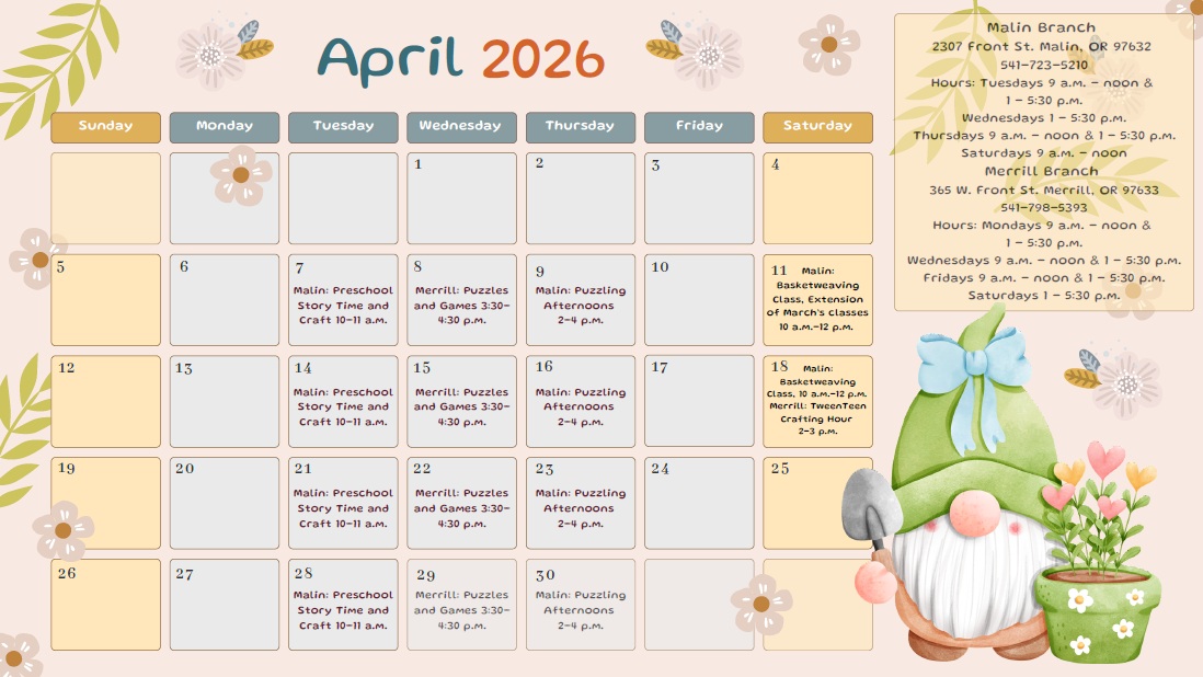 365 West Front Street Merrill, OR 97633 United States (541) 798-5393 merrillstaff@klamathlibrary.org Branch Hours Monday 9:00am – 12:00pm & 1:00pm – 5:30pm Wednesday 9:00am – 12:00pm & 1:00pm – 5:30pm Friday 9:00am – 12:00pm & 1:00pm – 5:30pm Saturday 1:00pm – 5:30pm